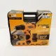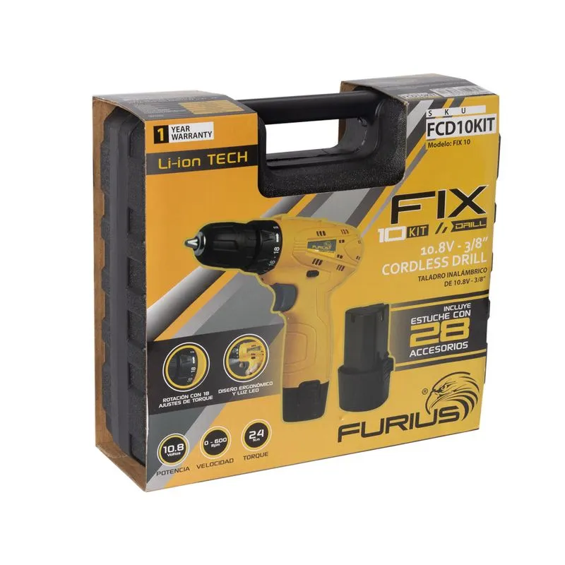 Incluye: 28 accesorios, 9 piezas de juego de copas, extensión flexible, 10 puntas, 4 brocas, extensor, cargador, 2 baterías de ion de lito, caja plástica.